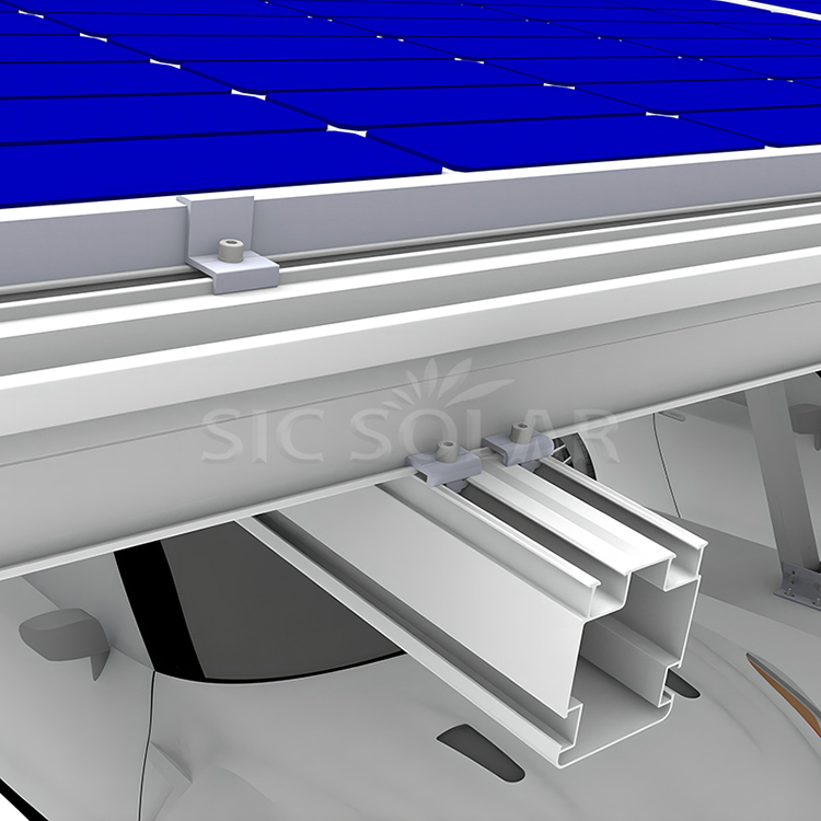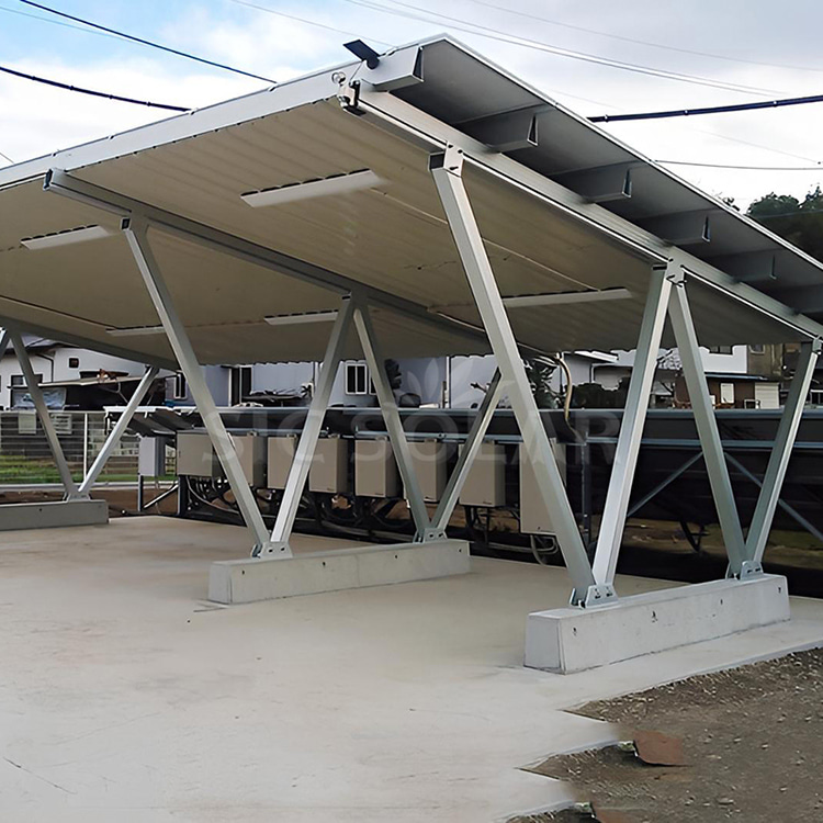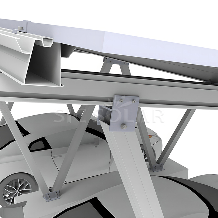 4)Sistem Pemasangan Carport Solar diperbuat daripada aloi aluminium AL6005-T5 dan bergantung pada teknologi kalis air untuk perlindungan hujan untuk menampung semua jenis dan saiz panel solar.
